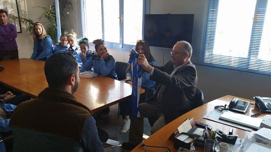 Οι αθλήτριες του Δήμου έκαναν δώρο στο Δήμαρχο μία φανέλα και ένα κασκόλ της ομάδας .