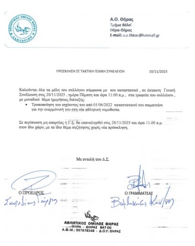 Σε τακτική Γενική Συνέλευση καλεί τα μέλη του ο Α.Ο. Θήρας, την Πέμπτη 20/11 στις 11.00